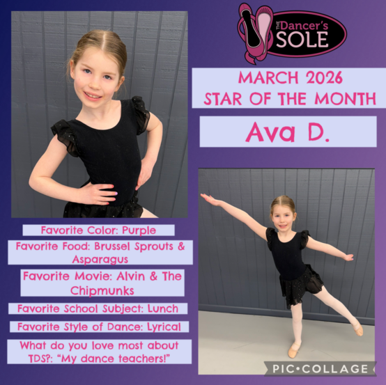 Each month, we post a photo of our current Star of the Month on our Facebook page, our Instagram page and our website. We also post their photos in our annual Recital program and announce their accomplishments in our monthly newsletter, “In The Wings.” These dancers have a choice between a $25 to WOW Dancewear in Auburn or a $25 tuition credit.